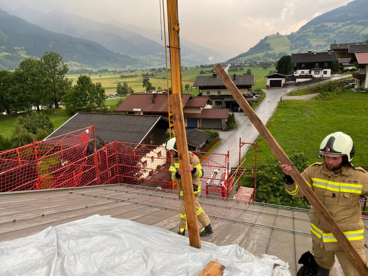 5. Seniorenwohnheim: Die provisorische Abdeckung der Dachhaut aufgrund der Sanierung/Erweiterung des Objektes wurde vom Sturm entfernet und wurde hier mittels Planen eine Abdichtung durchgeführt!